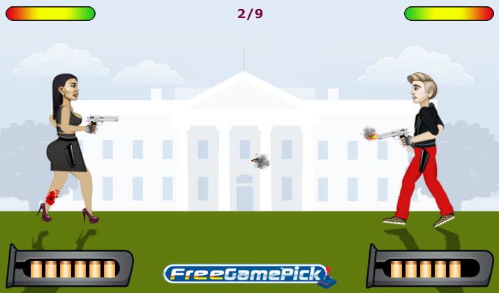 Члены команды FreeGamePick тщательно работали над этой игрой перед ее выпуском и сейчас проводится этап финального тестирования и исправления даже самых мелких недочетов. Надеемся, что вам понравятся карикатурные фигурки знаменитостей и полный адреналина процесс дуэли. Одно из главных правил для победы - успеть выстрелить первым! Если соперник нанесет удачный удар, то может убить тебя с одного выстрела, поэтому нужно быть начеку! Наведи мышку на запас патронов и пойдет отсчет, как только ты увидишь слово "FIRE" немедленно стреляй! Каждая доля секунды важна! Именно этот решающий момент принесет тонны адреналина и зачастую от него зависит твоя победа или поражение.
